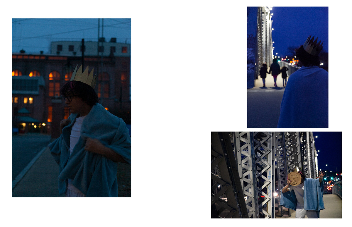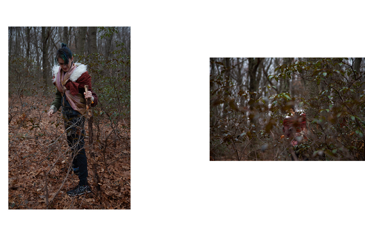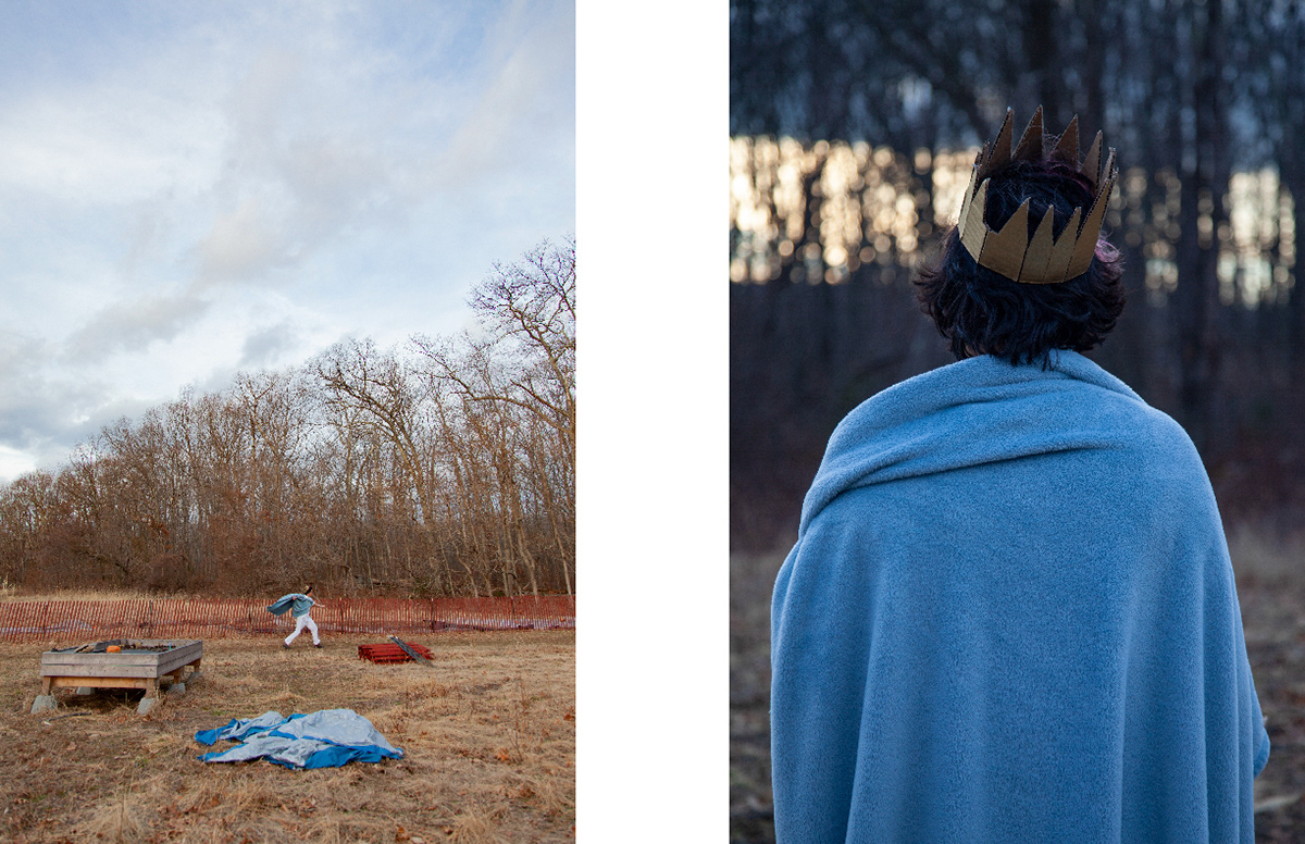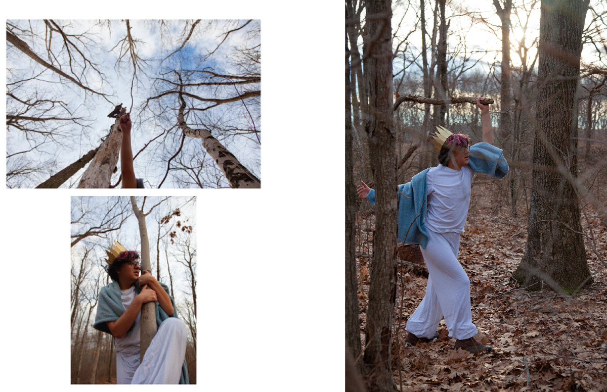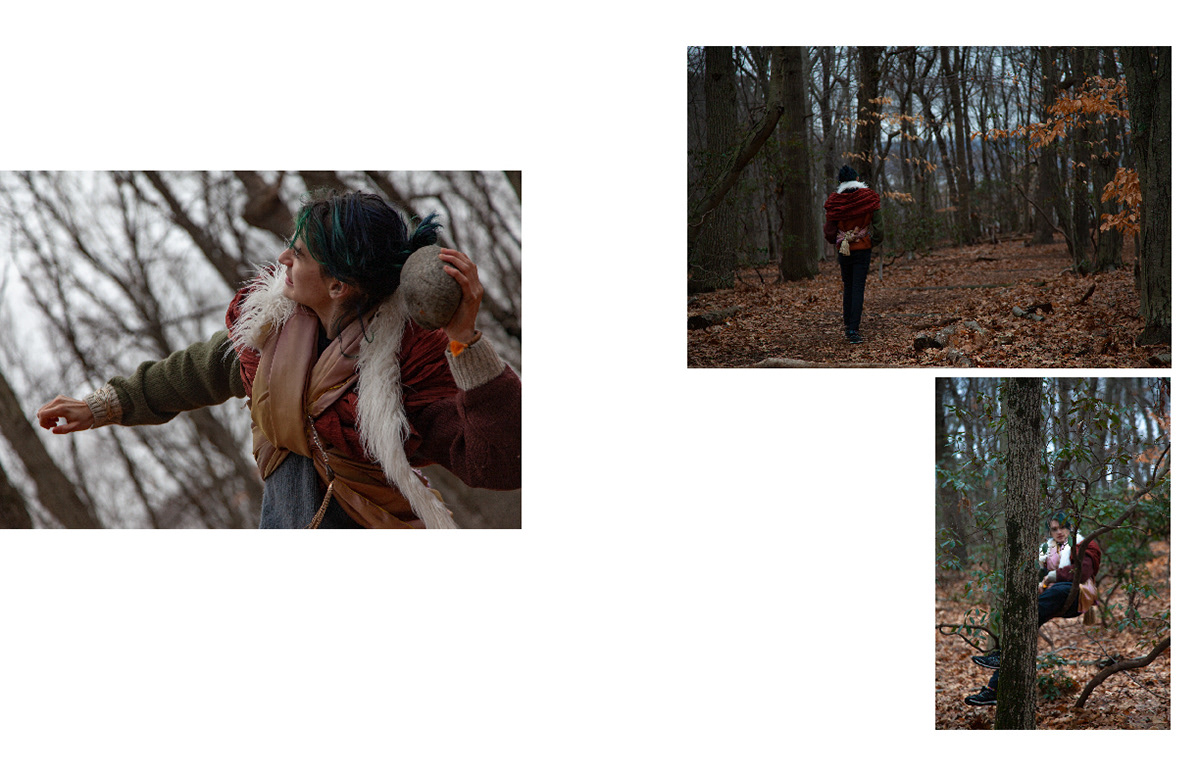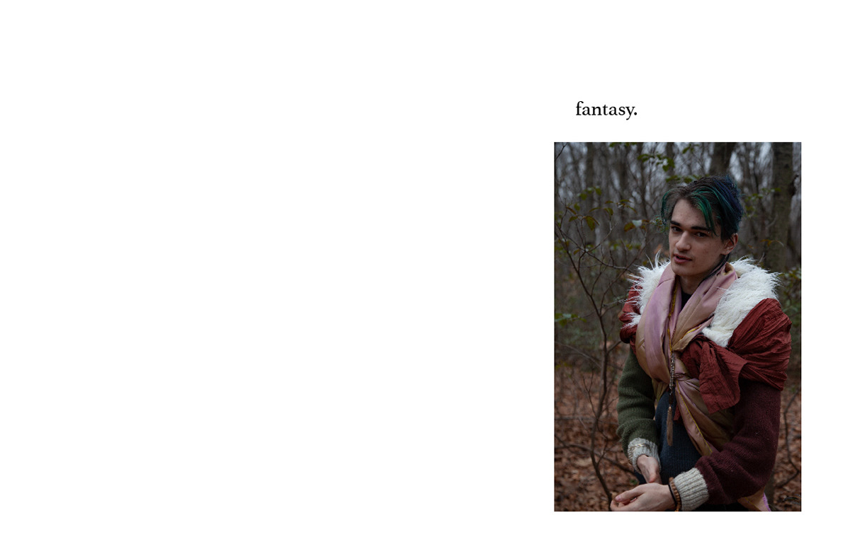 A curated collection of narrative portrait photography: three imaginary "characters" exploring diverse versions of the real world (future, storybook, fantasy) This is a digital scan of a hand-stitched photobook