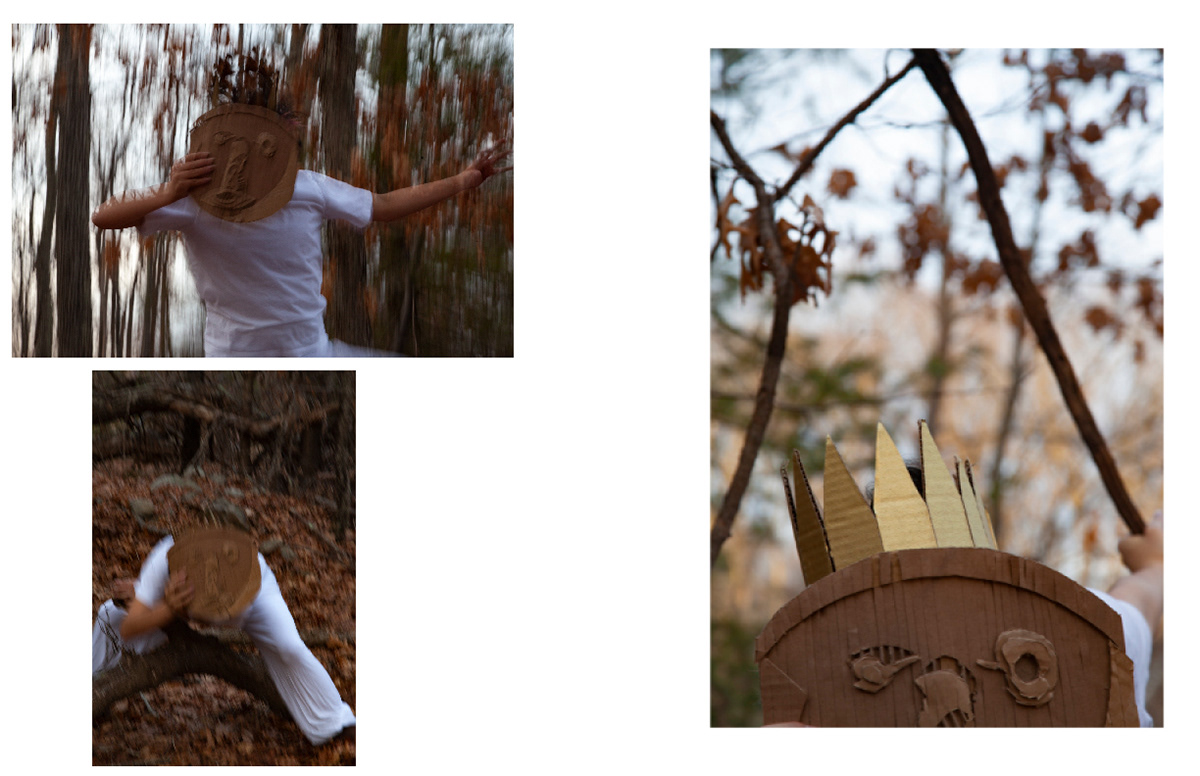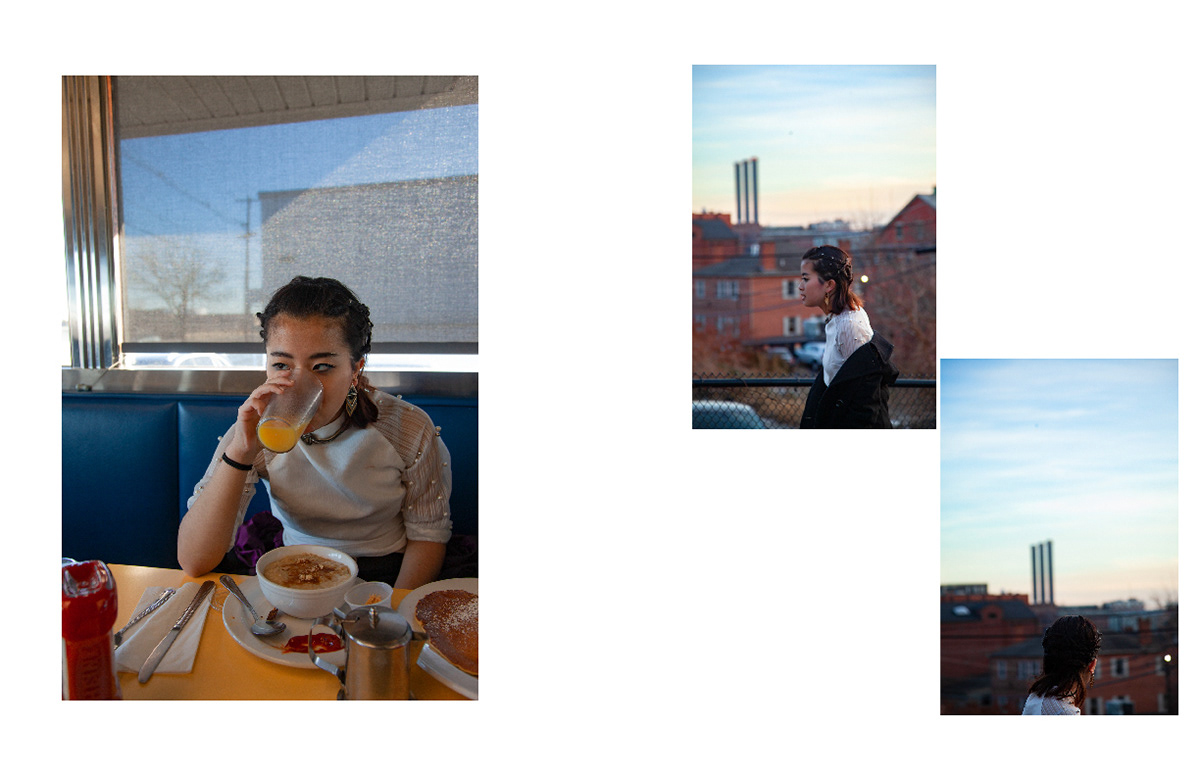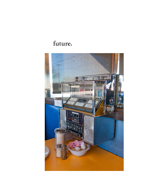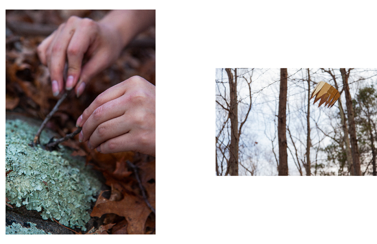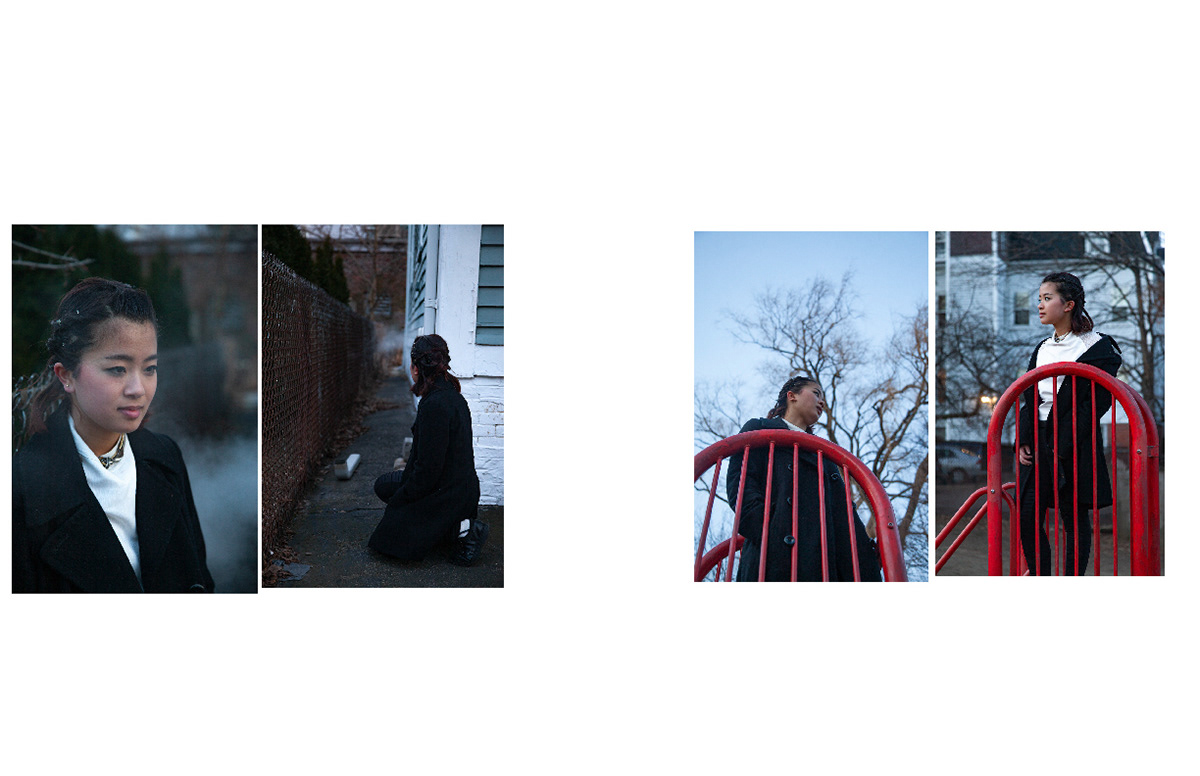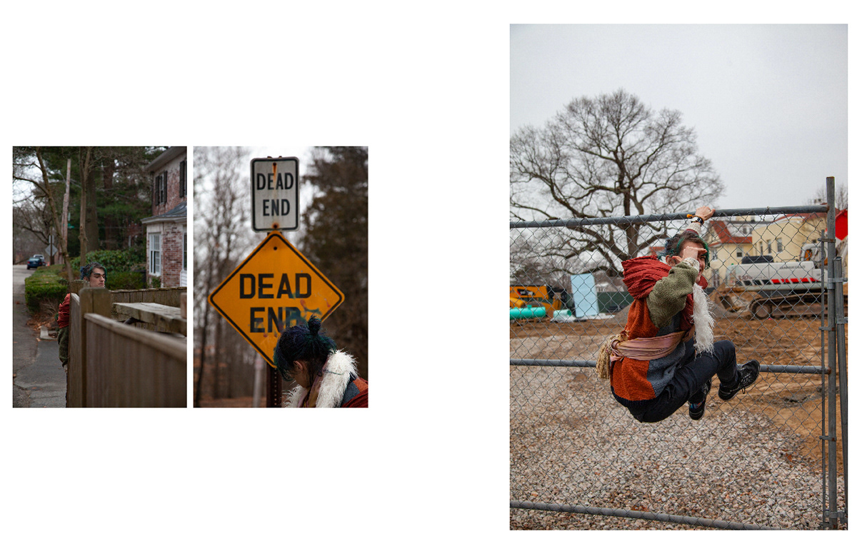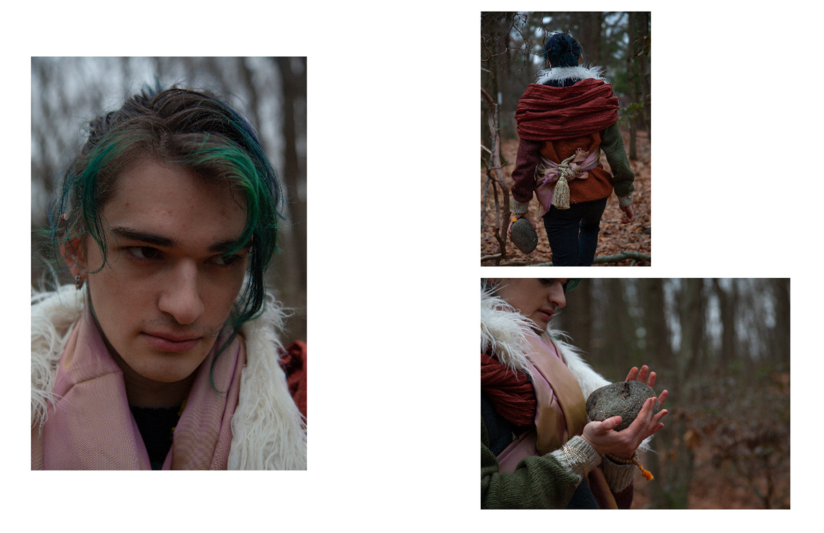 A curated collection of narrative portrait photography: three imaginary "characters" exploring diverse versions of the real world (future, storybook, fantasy) This is a digital scan of a hand-stitched photobook